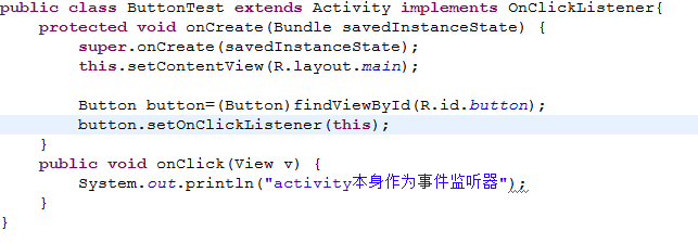 这种形式使用activity本身作为监听器类,可以直接在activity类中定义事件处理器方法,这种形式非常简洁。但这种做法有两个缺点:(1)这种形式可能造成程序结构混乱。Activity的主要职责应该是完成界面初始化;但此时还需包含事件处理器方法,从而引起混乱。(2)如果activity界面类需要实现监听器接口,让人感觉比较怪异。
