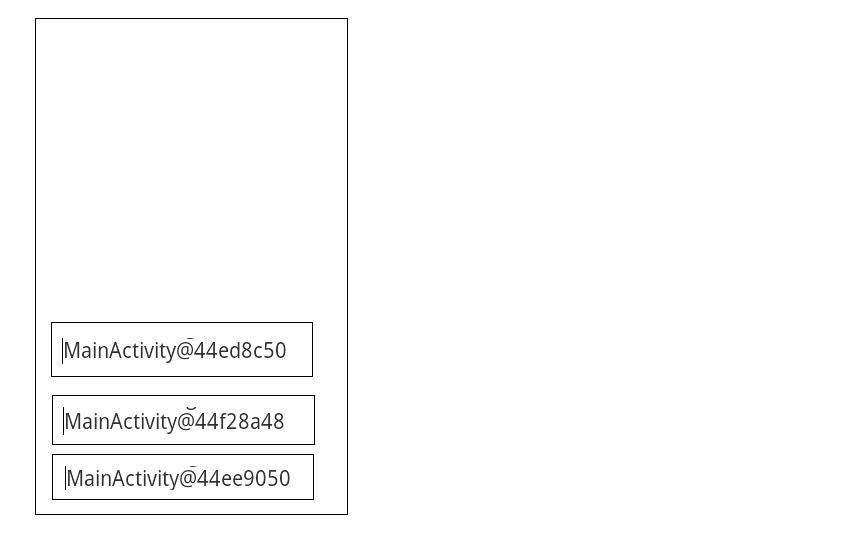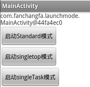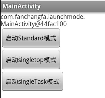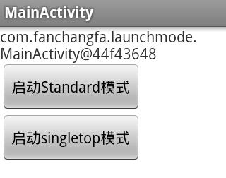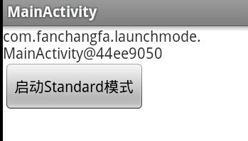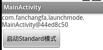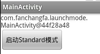 private TextView text_show;      private Button btn_mode;      @Override      public void onCreate(Bundle savedInstanceState) {          super.onCreate(savedInstanceState);          setContentView(R.layout.activity_main);          text_show = (TextView) this.findViewById(R.id.text_show);          text_show.setText(this.toString());          btn_mode = (Button) this.findViewById(R.id.btn_mode);      } //按钮单击事件      public void LaunchStandard(View v){          startActivity(new Intent(this,MainActivity.class));          text_show.setText(this.toString());      }