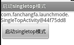 我们在刚才的界面中加入一个”启动singletop模式”按钮,当点击时出现我们创建的singletop中,在Activity singletop中有一个按钮,启动singletop模式,表示启动当前Activity,由于我们在清单文件中配置Activity的启动模式为 singleTop,因此此时不会再创建而是利用当前栈顶的singleTop Activity: