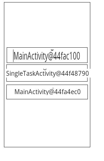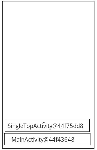 当在上面界面中点击”启动singleTask模式”按钮时,由于检测到当期栈中第二个为我们要创建的Activity,会将最上面的MainActivity消灭,然后将SingleTaskActivity设置为栈顶: