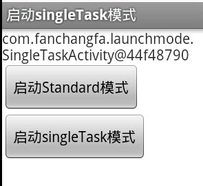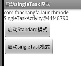 在此界面中点击第二个按钮”启动singleTask模式”按钮,根据定义会检测当前栈中是否有此Activity对象,因此显示的还是当前的Activity,不会重新创建;