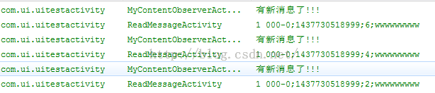 public class MyContentObserverActivity extends Activity {    @Override    protected void onCreate(Bundle savedInstanceState) {        // TODO Auto-generated method stub        super.onCreate(savedInstanceState);        setContentView(R.layout.activity_readcontact);        /**         * uri: 监听的是那个uri上的内容提供者的通知         * true:代表的是"content://sms", content://sms/inbox", "content://sms/outbox"都可以匹配         * false: 代表的是: "content://sms"只匹配这个         * 当数据改变后就会调用这个匿名类中的onchange方法         */        getContentResolver().registerContentObserver(Uri.parse("content://sms"), true,                 new ContentObserver(new Handler()) {                            @Override                public void onChange(boolean selfChange) {                    // TODO Auto-generated method stub                    //super.onChange(selfChange);                    Log.i("MyContentObserverActivity", "有新消息了!!!");                    ContentResolver cResolver = getContentResolver();                    /**                     * uri: 是短信提供者的url,可以通过查看源码获得                     * projection:需要查询的几个字段,关心那个查询按个就行                     * 按日期排序,取最后一个                     */                    Cursor cursor = cResolver.query(Uri.parse("content://sms"), new String[]{"address", "date", "type", "body"},                            null, null, "date");                    if(cursor.moveToLast())                    {                        String address = cursor.getString(cursor.getColumnIndex("address"));                        String date = cursor.getString(cursor.getColumnIndex("date"));                        String type = cursor.getString(cursor.getColumnIndex("type"));                        String body = cursor.getString(cursor.getColumnIndex("body"));                                                Log.i("ReadMessageActivity", address + ";" + date + ";" + type + ";" + body);                    }                }        });    }}