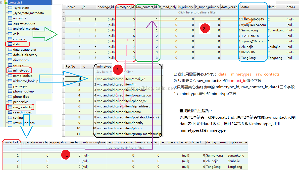 上图就是如何到数据库中找打系统的联系人数据,(看起来图画的有点乱,希望能看懂吧)