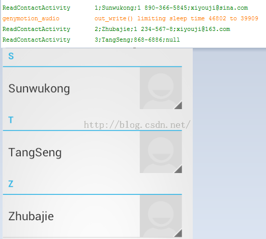 public class ReadContactActivity extends Activity { @Override protected void onCreate(Bundle savedInstanceState) { // TODO Auto-generated method stub super.onCreate(savedInstanceState); setContentView(R.layout.activity_readcontact); } public void readContact(View v) { ContentResolver cr = getContentResolver(); /* * 先到raw_contacts表中拿到contact_id * content://com.android.contacts/raw_contacts是raw_contacts的访问url * */ Cursor contactId = cr.query(Uri.parse("content://com.android.contacts/raw_contacts"), new String[]{"contact_id"}, null, null, null); while(contactId.moveToNext()) { /* * 拿到contact_id接着到data表中去根据raw_contact_id获取mimetype_id和data1数据 * */ String id = contactId.getString(contactId.getColumnIndex("contact_id")); /** * "content://com.android.contacts/data"是访问data表的url * 通过id也就是contact_id去data表中找,data1, raw_contact_id, mimetype_id. * 但是, id就是raw_contact_id,所以就不用再找了。而mimetype_id由于Android系统为我们自己优化了一些细节,当你在data表中找mimetype_id是找不到的 * android系统直接将mimetype_id转变为找mimetype了 */ Cursor contactData = cr.query(Uri.parse("content://com.android.contacts/data"), new String[]{"data1", "mimetype"}, "raw_contact_id = ?", new String[]{id}, null); String email = null, phone = null, name = null; while(contactData.moveToNext()) { String data1 = contactData.getString(contactData.getColumnIndex("data1")); String mimetype = contactData.getString(contactData.getColumnIndex("mimetype")); /*如果mimetype是邮箱*/ if("vnd.android.cursor.item/email_v2".equals(mimetype)) { email = data1; }//如果mimetype是电话 else if ("vnd.android.cursor.item/phone_v2".equals(mimetype)) { phone = data1; }//如果mimetype是名字 else if ("vnd.android.cursor.item/name".equals(mimetype)){ name = data1; } } Log.i("ReadContactActivity", id + ';' + name + ";" + phone + ";" + email); } }}打印结果为: