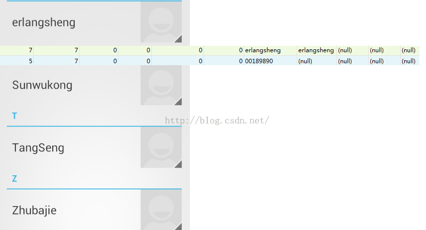 public void insertContact(View v) { ContentResolver cr = getContentResolver(); Cursor cursor = cr.query(Uri.parse("content://com.android.contacts/raw_contacts"), new String[]{"_id"}, null, null, null); /*如果数据库中没有数据,则插入的就是第一条数据*/ int contactId = 1; if(cursor.moveToLast()) { /*如果有数据,就插入到最新的写一条*/ int id = cursor.getInt(cursor.getColumnIndex("_id")); contactId = id + 1; } ContentValues values = new ContentValues(); /*将新的id插入到raw_contacts表中*/ values.put("contact_id", contactId); cr.insert(Uri.parse("content://com.android.contacts/raw_contacts"), values); /*插入名字*/ values.clear(); values.put("data1", "erlangsheng"); values.put("mimetype", "vnd.android.cursor.item/name"); values.put("raw_contact_id", contactId); cr.insert(Uri.parse("content://com.android.contacts/data"), values); /*插入电话*/ values.clear(); values.put("data1", "00189890"); values.put("mimetype", "vnd.android.cursor.item/phone_v2"); values.put("raw_contact_id", contactId); cr.insert(Uri.parse("content://com.android.contacts/data"), values); }}结果为: