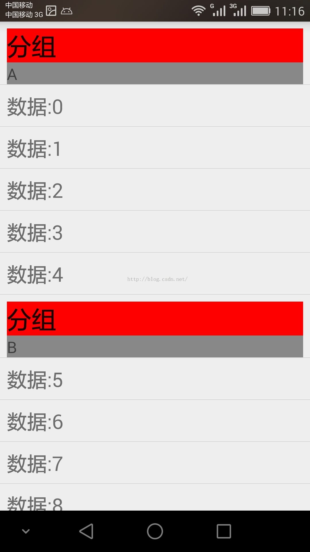 package zhangphil.listview;import java.util.ArrayList;import java.util.HashMap;import android.app.ListActivity;import android.content.Context;import android.graphics.Color;import android.os.Bundle;import android.view.LayoutInflater;import android.view.View;import android.view.ViewGroup;import android.widget.BaseAdapter;import android.widget.ListView;import android.widget.TextView;public class MainActivity extends ListActivity {	// item view的类型总数。	private final int VIEW_TYPE_COUNT = 2;	private final String DATA = "data";	private final String TYPE = "type";	private final int GROUP = -2;	private final int ITEM = -3;	private ArrayList<HashMap<String, Object>> items = null;	@Override	protected void onCreate(Bundle savedInstanceState) {		super.onCreate(savedInstanceState);		ListView listView = this.getListView();		BaseAdapter adapter = new MyBaseAdapter();		items = new ArrayList<HashMap<String, Object>>();		listView.setAdapter(adapter);		// 假设我们演示以A,B,C,,,这样的字符串作为分组的标签。		// 每一组装载5个子数据。		String[] groups = { "A", "B", "C", "D", "E", "F" };		int count = 0;		for (int i = 0; i < groups.length; i++) {			HashMap<String, Object> group_map = new HashMap<String, Object>();			group_map.put(TYPE, GROUP);			group_map.put(DATA, groups[i]);			items.add(group_map);			for (int j = 0; j < 5; j++) {				HashMap<String, Object> data_map = new HashMap<String, Object>();				data_map.put(TYPE, ITEM);				data_map.put(DATA, "数据:" + (count++));				items.add(data_map);			}		}	}	private class MyBaseAdapter extends BaseAdapter {		private LayoutInflater inflater = null;		public MyBaseAdapter() {			inflater = (LayoutInflater) getSystemService(Context.LAYOUT_INFLATER_SERVICE);		}		@Override		public int getCount() {			return items.size();		}		@Override		public Object getItem(int position) {			HashMap<String, Object> map = items.get(position);			return map.get(DATA);		}		// 返回的id可以自己定制。		@Override		public long getItemId(int position) {			return position;		}		@Override		public View getView(int position, View convertView, ViewGroup parent) {						int type = getItemViewType(position);						// 根据不同的view type加载不同的布局文件。			switch (type) {			case GROUP:				convertView = inflater.inflate(						android.R.layout.simple_list_item_2, null);				TextView tv1 = (TextView) convertView						.findViewById(android.R.id.text1);				tv1.setText("分组");				tv1.setBackgroundColor(Color.RED);				TextView tv2 = (TextView) convertView						.findViewById(android.R.id.text2);				tv2.setText(getItem(position) + "");				tv2.setBackgroundColor(Color.GRAY);				break;			case ITEM:				convertView = inflater.inflate(						android.R.layout.simple_list_item_1, null);				TextView tv = (TextView) convertView						.findViewById(android.R.id.text1);				tv.setText(getItem(position) + "");				break;			}			return convertView;		}		// 解析view type。		// view type值是我们事先埋入到items数据集中的字段值。		// 注意!此处返回的值不要大于getViewTypeCount()的返回值。		@Override		public int getItemViewType(int position) {			HashMap<String, Object> map = items.get(position);			return (Integer) map.get(TYPE);		}		// 在本例中共计有2个不同类型的view		// android.R.layout.simple_list_item_1 和		// android.R.layout.simple_list_item_1.		@Override		public int getViewTypeCount() {			return VIEW_TYPE_COUNT;		}	}}