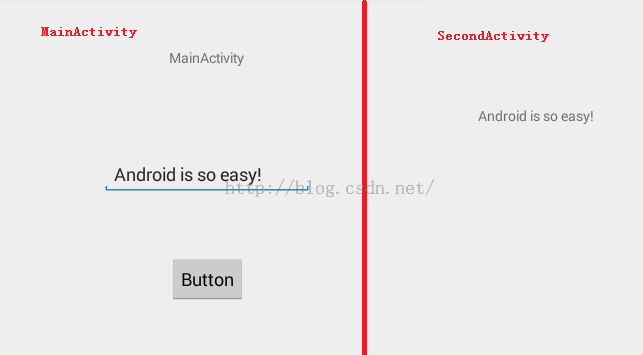 <TextView android:id="@+id/textView1" android:layout_width="wrap_content" android:layout_height="wrap_content" android:layout_alignParentTop="true" android:layout_centerHorizontal="true" android:layout_marginTop="53dp" android:text="MainActivity" /> <Button android:id="@+id/button1" android:layout_width="wrap_content" android:layout_height="wrap_content" android:layout_alignLeft="@+id/textView1" android:layout_below="@+id/textView1" android:layout_marginTop="188dp" android:text="Button" /> <EditText android:id="@+id/editText1" android:layout_width="wrap_content" android:layout_height="wrap_content" android:layout_below="@+id/textView1" android:layout_centerHorizontal="true" android:layout_marginTop="87dp" android:ems="10" />我增加了一个EditText,通过在EditText中输入的字符,然后传递给SecondActivity中的TextView显示