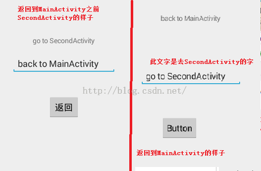 public class MainActivity extends Activity { private EditText editText; private TextView textView; @Override protected void onCreate(Bundle savedInstanceState) { super.onCreate(savedInstanceState); setContentView(R.layout.activity_main); //获得Button控件 Button button = (Button)findViewById(R.id.button1); //获得EditText控件 editText = (EditText)findViewById(R.id.editText1); textView = (TextView)findViewById(R.id.textView1); //给Button控件设置监听器 button.setOnClickListener(new OnClickListener() { @Override public void onClick(View v) { // 当按下时,通过Intent跳转到SecondActivity Log.i("Activity_Log", "Button按下"); //new一个Intent Intent intent = new Intent(MainActivity.this, SecondActivity.class); //获得Edittext中输入的字符 String string = editText.getText().toString(); //将获得字符放入Intent intent.putExtra("12345", string); //启动Activity,带返回 startActivityForResult(intent, 5678); } }); } //当SecondActivity返回时,就会调用onActivityResult @Override protected void onActivityResult(int requestCode, int resultCode, Intent data) { // TODO Auto-generated method stub if(requestCode == 5678)//判断请求码 { if(resultCode == 8890)//判断返回码 { //取出返回的数据显示在textview上 Bundle b= data.getExtras(); String string = b.getString("12345"); textView.setText(string); } } super.onActivityResult(requestCode, resultCode, data); }}SecondActivity的逻辑代码:public class SecondActivity extends Activity { private TextView textView; private EditText editText; private Button backButton; private Intent intent; @Override protected void onCreate(Bundle savedInstanceState) { // TODO Auto-generated method stub super.onCreate(savedInstanceState); setContentView(R.layout.activity_second); Log.i("Activity_Log", "SecondActivity被创建"); textView = (TextView)findViewById(R.id.textView1); editText = (EditText)findViewById(R.id.editText1); backButton = (Button)findViewById(R.id.button1); //获得启动SecondActivity的Intent,也就是MainActivity中new 的intent intent = this.getIntent(); //获得传进来的值 Bundle bundle = intent.getExtras(); //通过key值找到所对应的Value String string = bundle.getString("12345"); //设置的TextView textView.setText(string); backButton.setOnClickListener(new OnClickListener() { @Override public void onClick(View v) { // 往传进来的Intent设置数据 String backString = editText.getText().toString(); intent.putExtra("12345", backString); //设置返回码 setResult(8890, intent); //关掉当前的activity finish(); } }); }}显示效果如下: