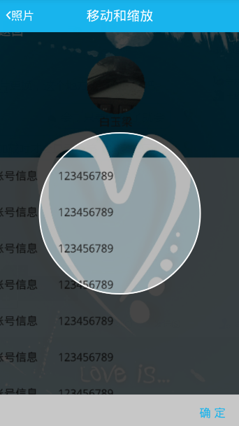 截取头像界面添加了与qq类似的阴影层(裁剪区域以外的部分),且看效果图: