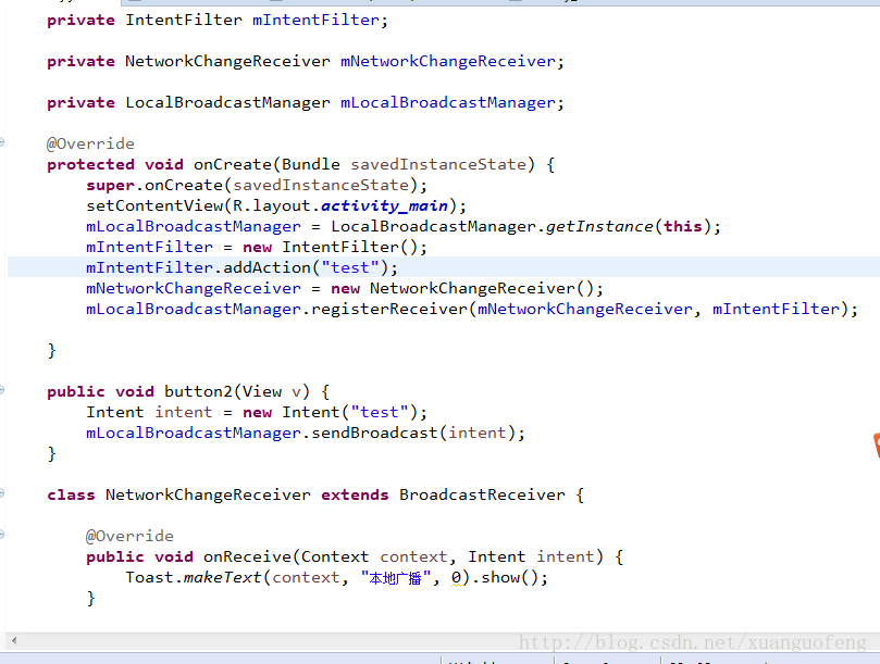 1先写一个广播的类继承BroadcastReceiver在里面做一些收到本地广播的操作