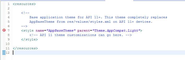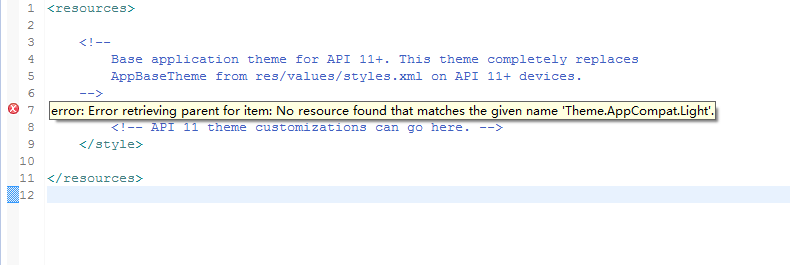 找不到父类style,下面有写项目的版本要11以上,你在项目下的project.properties文件中修改target=android-15,再clean项目