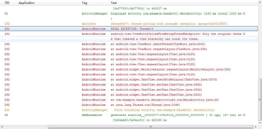 @Override protected void onCreate(Bundle savedInstanceState) { super.onCreate(savedInstanceState); setContentView(R.layout.activity_main); textview = (TextView) findViewById(R.id.textview); /* * 子线程不能进行视图的更新 */ new Thread(new Runnable() { @Override public void run() { try { Thread.sleep(1000);//模拟网络加载 } catch (InterruptedException e) { e.printStackTrace(); } textview.setText("更新视图"); } }).start();