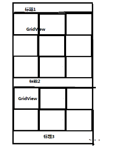 在你的Activity中设置只有一个ListView的布局,第一个主布局,拿到ListView并设置Adapter,用BaseAdapter吧,重写BaseAdapter的getView(int position, View convertView, ViewGroup parent),在这里加载一个条目布局,给条目布局TextView设置标题,int position就是第几个条目,给上对应的名字就OK了,给条目布局ListView装多个三框布局,再给这个ListView设置Adapter,也用BaseAdapter吧,重写里面BaseAdapter的getView(int position, View convertView, ViewGroup parent)方法,创建一个View来装多个用LayoutInflater加载三框布局并把装配好的View返回
