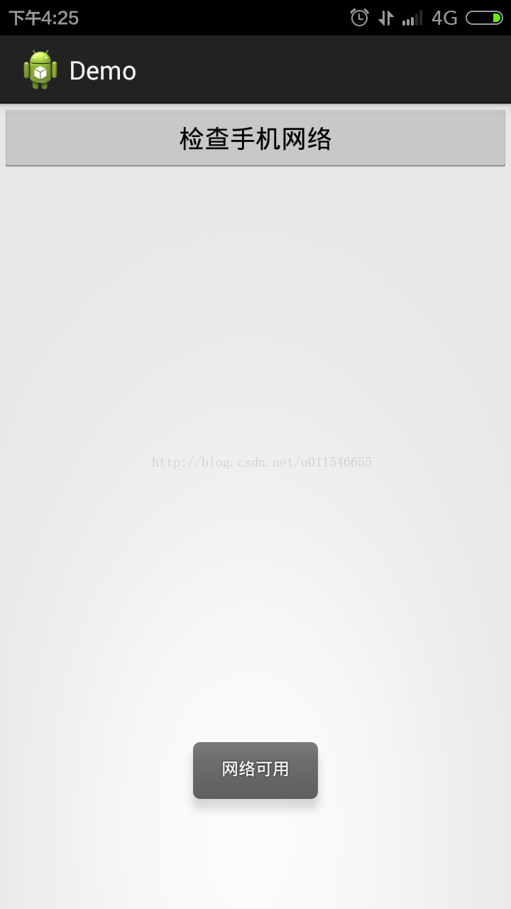 package com.zengtao.classwork;import android.content.Context;import android.net.ConnectivityManager;import android.net.NetworkInfo;import android.os.Bundle;import android.support.v7.app.ActionBarActivity;import android.view.View;import android.view.View.OnClickListener;import android.widget.Button;import android.widget.Toast;public class MainActivity extends ActionBarActivity { private Button bt_checknetwork; @Override protected void onCreate(Bundle savedInstanceState) { super.onCreate(savedInstanceState); setContentView(R.layout.activity_main); bt_checknetwork = (Button) findViewById(R.id.bt_checknetwork); bt_checknetwork.setOnClickListener(new OnClickListener() { @Override public void onClick(View v) { // 1.获取系统服务 ConnectivityManager cm = (ConnectivityManager) MainActivity.this .getSystemService(Context.CONNECTIVITY_SERVICE); // 2.获取net信息 NetworkInfo info = cm.getActiveNetworkInfo(); // 3.判断网络是否可用 if (info != null && info.isConnected()) { Toast.makeText(MainActivity.this, "网络可用", Toast.LENGTH_SHORT).show(); } else { Toast.makeText(MainActivity.this, "网络当前不可用,请检查设置!", Toast.LENGTH_SHORT).show(); } } }); }}3.解析