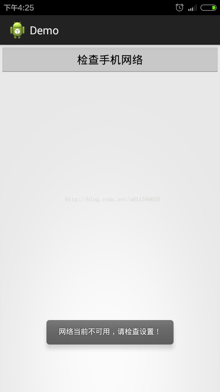 手机网络是否可用:这只是一个小demo,平时开发的过程中,用到的其实也是比较多的,比如:有一些新闻客户端当你乜有网络的时候,图片变不能查看,或者我们常用的QQ,当你没有网络的时候,变会在你的头部给你一个提示:世界上最远的距离就是没有网络,请检查设置