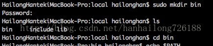 1.打开命令窗口,cd /usr/local/bin下,可能有的mac电脑不存在bin这个目录,直接在创建一个就好了,命令是:sudo mkdir bin,执行后会让你输入root权限密码,输入完后执行ls命令查看,bin目录就存在了,如图: