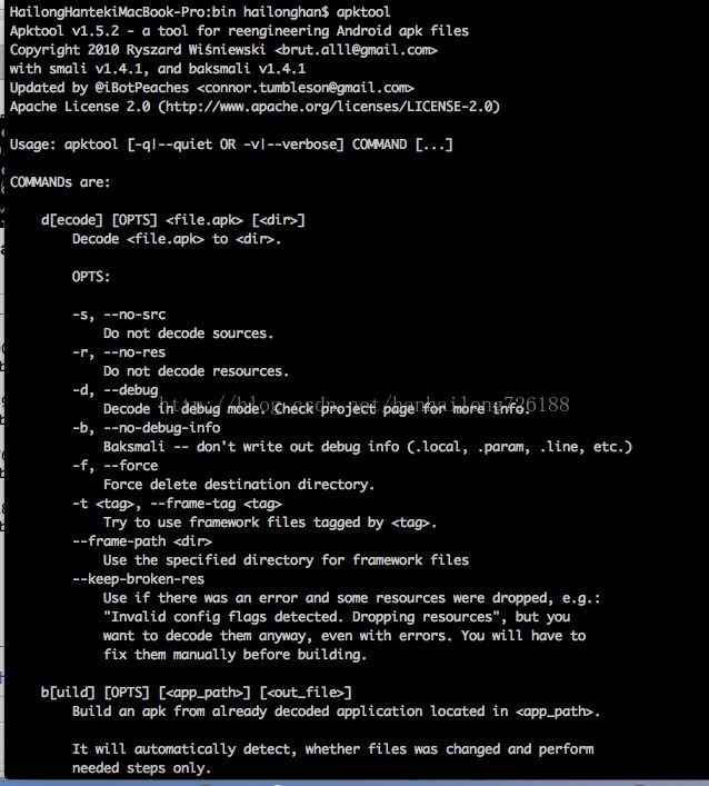 这也是我们把apktool3个文件放在/usr/local/bin下的原因,现在你再输入apktool命令试试: