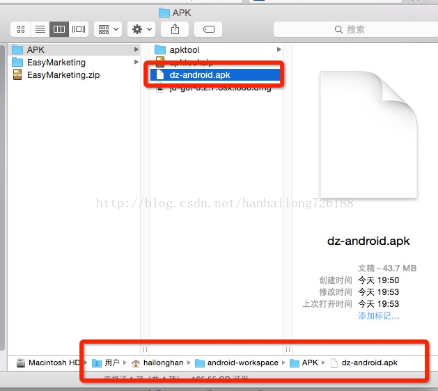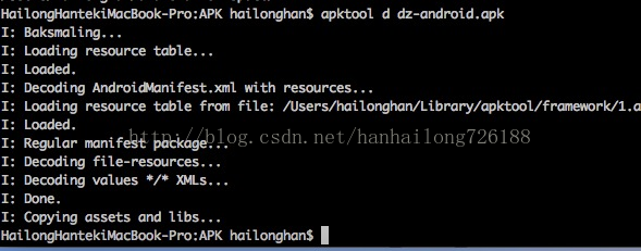 我们要对dz-android.apk进行反编译,命令行进入这个目录 cd /Users/hailonghan/android-workspace/APK,到这个目录后,