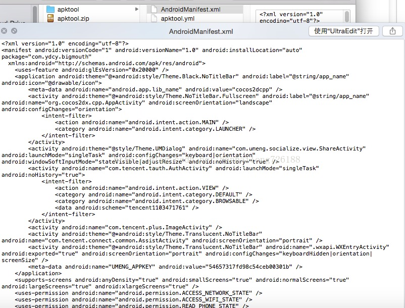 执行成功后,会在当前目录下生成一个da-android文件夹,点击去就看到相关apk的资源文件了,选中AndroidManifest.xml,然后空格键,就可以看到反编译后的内容了: