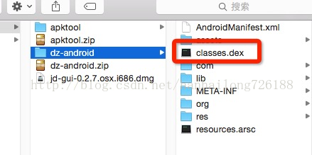 这就用到dex2jar和jd-gui了,将dz-android.apk重命名改成dz-android.zip,然后利用解压缩软件解压,得到一个dz-android目录,我们要拿到里面的classes.dex文件,如图: