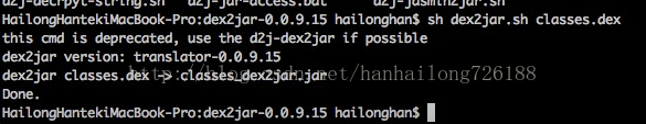 然后执行命令:sh dex2jar.sh classes.dex,如图: