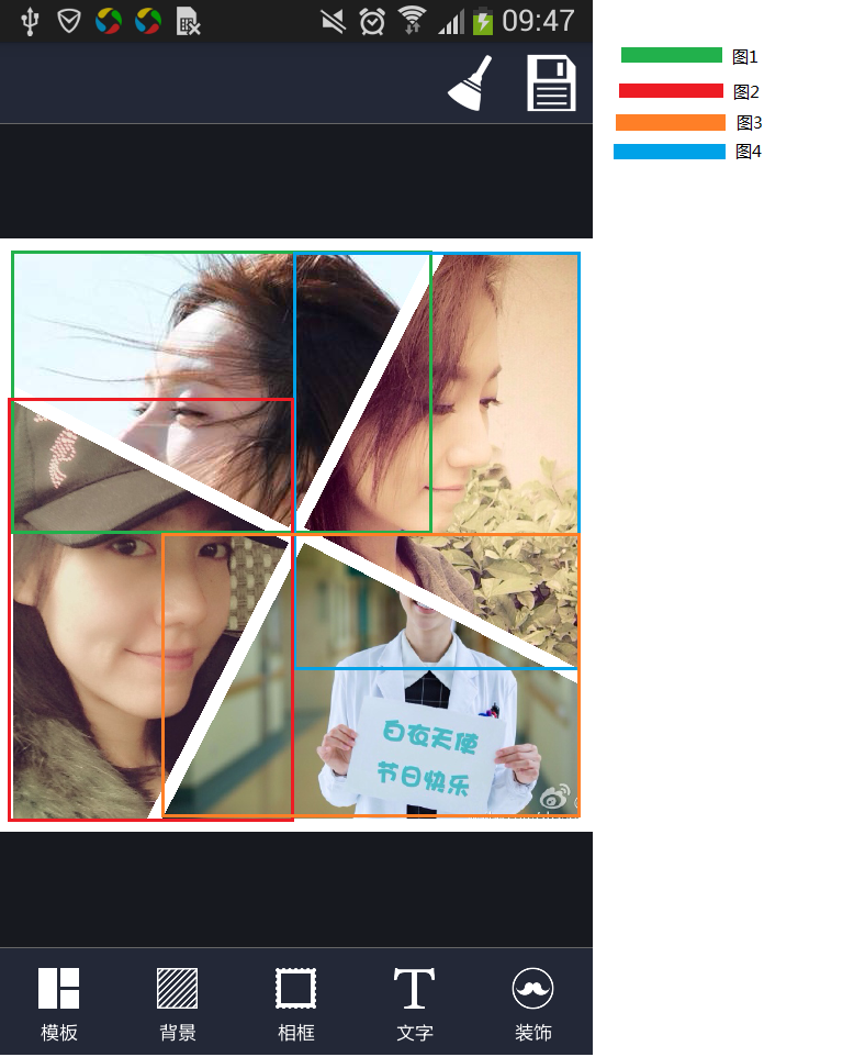 图中分别用4种不同的颜色圈住所对应的图片,绿色部分为上图(图1)、红色部分为左图(图2)、橙色部分为下图(图3)、蓝色部分为右图(图4),这些圈就是代表每个图片的实际大小(更恰当的说相当于是ImageView控件的大小才对,因为图片是各种大小都可以的),那么问题就来了!由于这整个都是用画板canvas画出来的,都是不规则的布局!因此实际上根本不存在ImageView控件。所以才圈出每个图的实际位置大小。然而在移动或缩放图片的时候,就不能让图片越界(只能在圈内)。所以这个越界该怎么处理呢?求帮助!