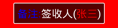 //为文本框设置多种颜色 textView=(TextView)findViewById(R.id.text_show); SpannableStringBuilder style = new SpannableStringBuilder("备注:签收人(张三)"); style.setSpan(new ForegroundColorSpan(Color.BLUE), 0, 3, Spannable.SPAN_EXCLUSIVE_EXCLUSIVE); style.setSpan(new ForegroundColorSpan(Color.RED), 7, 9, Spannable.SPAN_EXCLUSIVE_EXCLUSIVE); textView.setText(style);