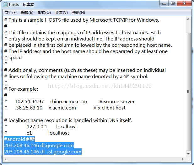 用记事本打开hosts文件,在最后一行添加如下代码: