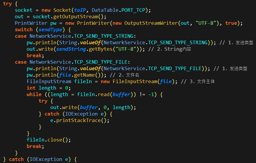 1、发送PrintWriter.println()告诉接收方接下来要传送的是String还是File