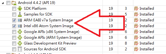 安装 SDK 时没有安装 system image ,看 CPU/ABI 那一栏。