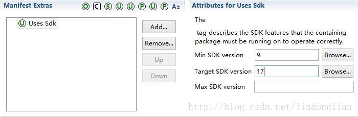 找到AndroidManifest.xml,Mainfest打开,点击Uses Sdk