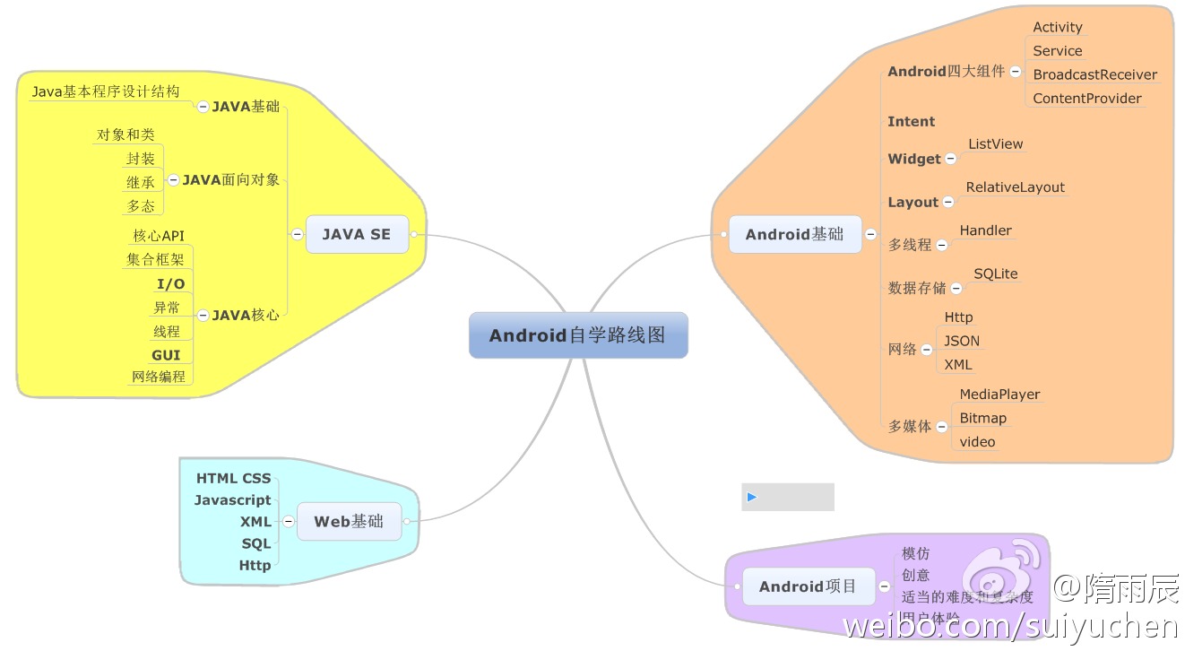 Android从入门到初级,自学路线可以参照如下思维导图。