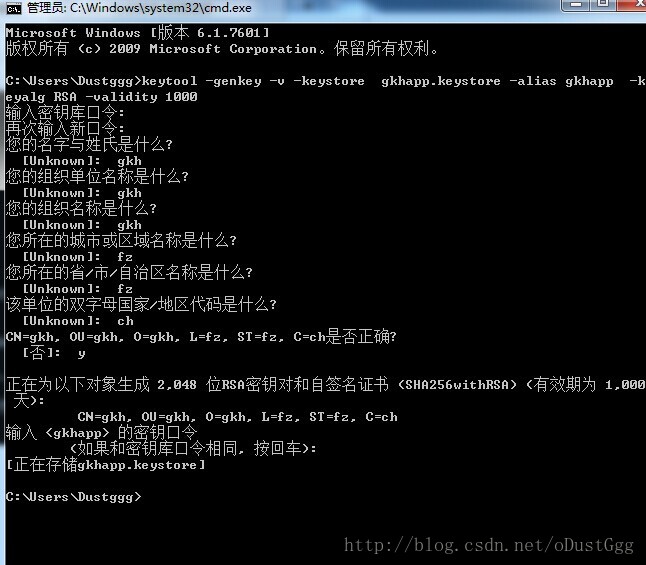 输入命令:keytool -genkey -v -keystore gkhapp.keystore -alias gkhapp -keyalg RSA -validity 1000