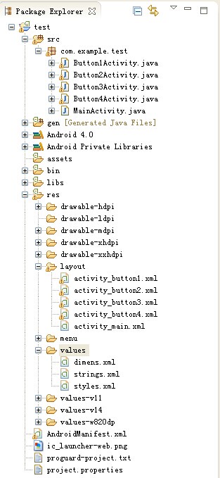 1、src目录:存放java源代码的目录,里面建立一个包,包里面有4个java源文件(分别都继承自Activity)。由于java要求比较严格,因此要求类名与文件名一致。