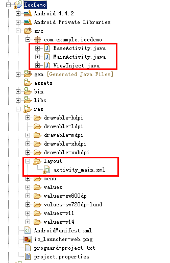结构很简单,一个基类,一个子类,一个自定义注释类型,一个布局文件。
