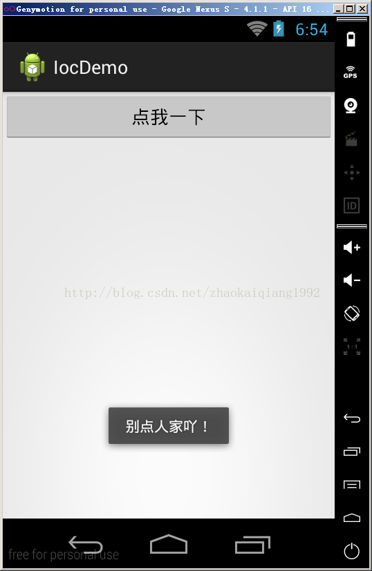 package com.example.iocdemo;import android.os.Bundle;import android.widget.Button;public class MainActivity extends BaseActivity { //用注释进行控件的初始化 @ViewInject(id = R.id.btn) Button btn; @Override protected void onCreate(Bundle savedInstanceState) { super.onCreate(savedInstanceState); setContentView(R.layout.activity_main); //进行注入 initInjectedView(this); }}下面是我们的运行结果