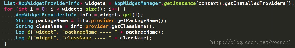 获取所有widget跟获取所有应用的方法类似,返回一个AppWidgetProviderInfo的List,通过AppWidgetProviderInfo可以获取Widget的包名跟类名,获取方法如下: