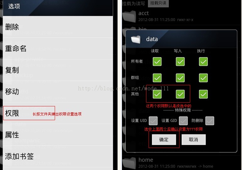 3.修改要查看文件的权限,下载一个RE(R.E管理器)并安装在手机上,运行,长按要查看的文件,在弹出的列表中选择“权限”,然后进入修改界面,
