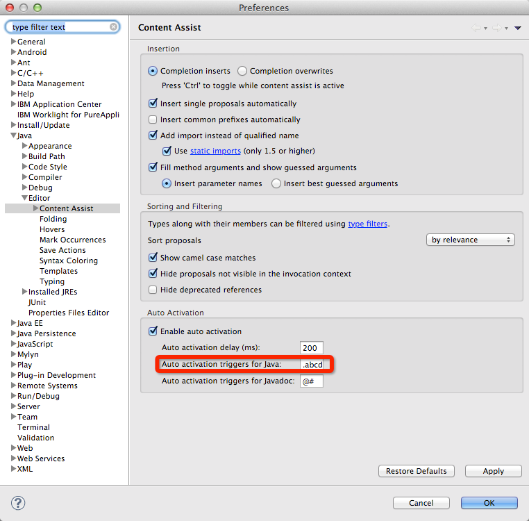 打开windows->Preferences->java->Editor->content assist; 如图: