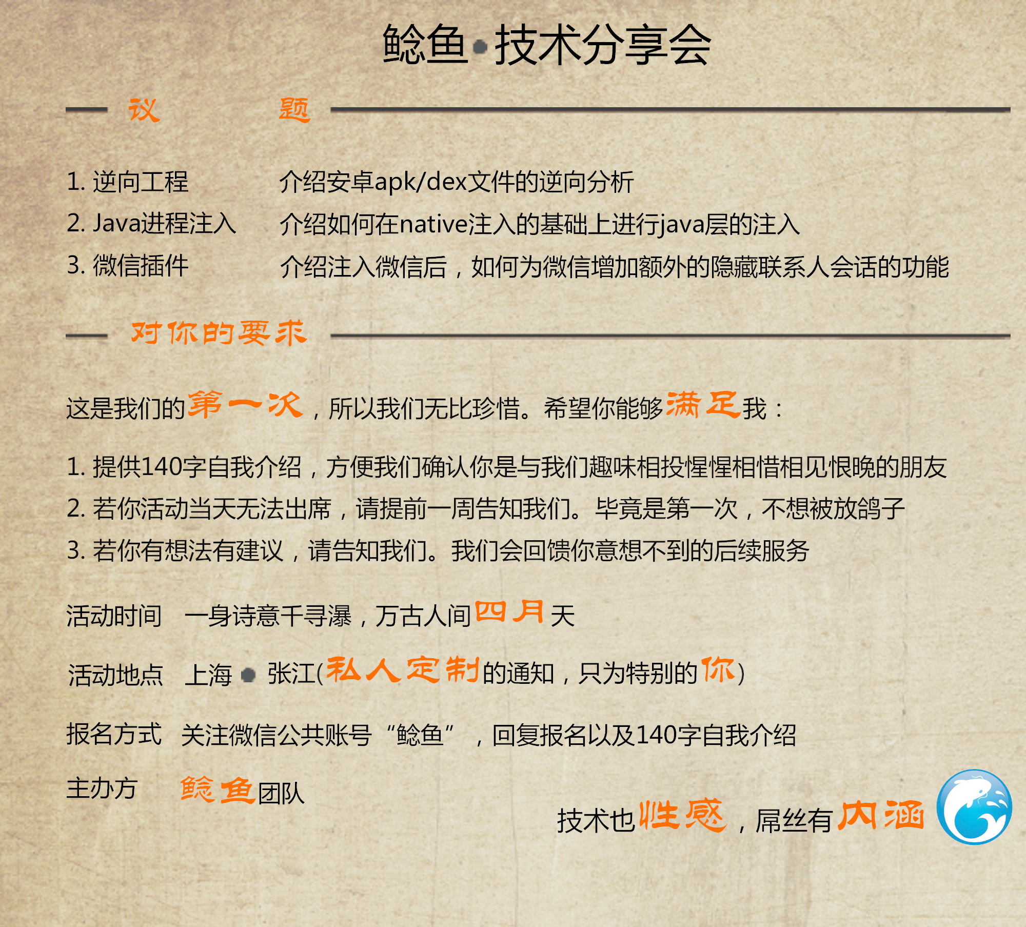 鲶鱼团队的第一次线下技术交流会将于4月20号在上海举办。如果你喜欢小分队,如果你对我们的技术交流有期待,请果断报名吧!