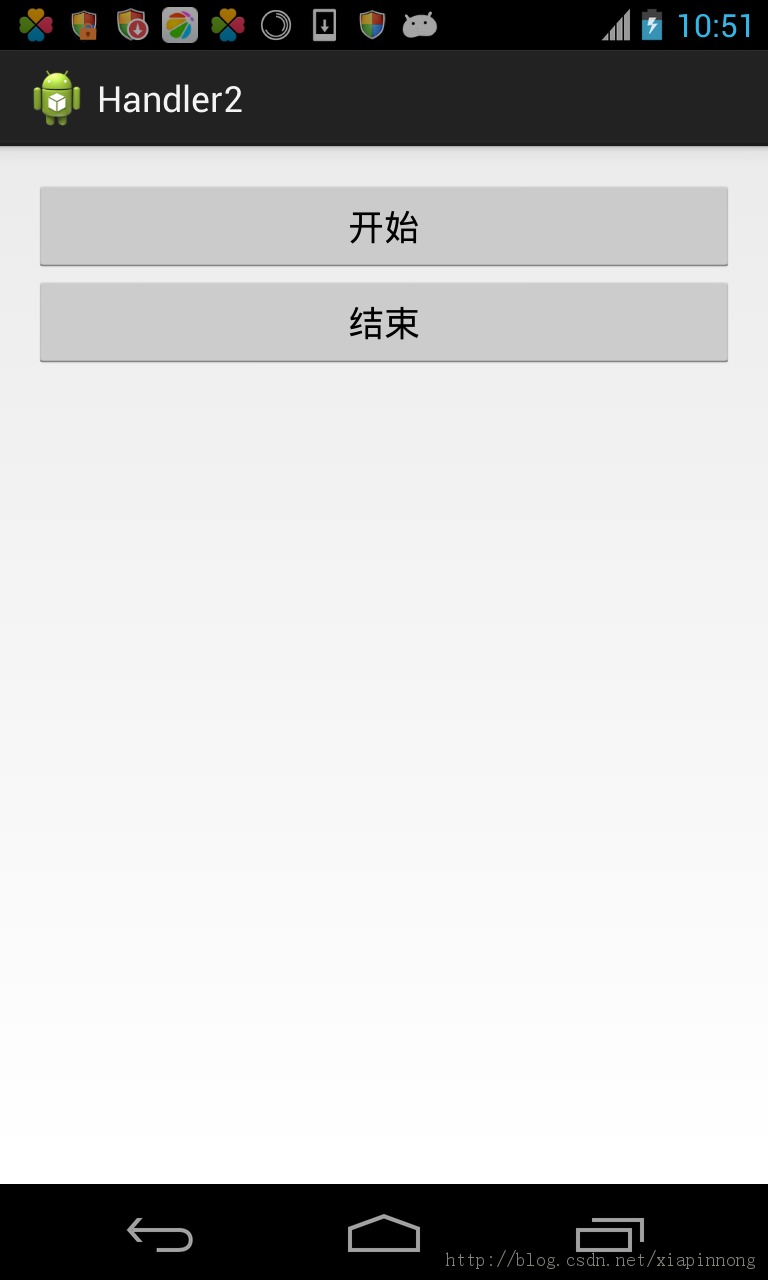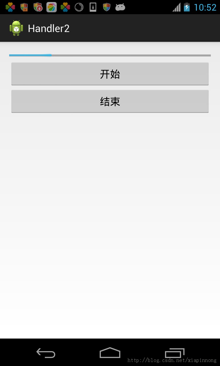 package com.example.handler2;import android.app.Activity;import android.os.Bundle;import android.os.Handler;import android.os.Message;import android.util.Log;import android.view.View;import android.view.View.OnClickListener;import android.widget.Button;import android.widget.ProgressBar;public class MainActivity extends Activity { Button startButton = null; Button stopButton = null; ProgressBar progressbar = null; @Override protected void onCreate(Bundle savedInstanceState) { super.onCreate(savedInstanceState); setContentView(R.layout.activity_main); startButton = (Button) findViewById(R.id.startButton); stopButton = (Button) findViewById(R.id.stopButton); progressbar = (ProgressBar) findViewById(R.id.progressBar); //为button绑定onclicklistener startButton.setOnClickListener(new ButtonOnclickListener()); stopButton.setOnClickListener(new stopOnclickListener()); } class ButtonOnclickListener implements OnClickListener{ public void onClick(View v) { //让progressbar显示在界面上 progressbar.setVisibility(View.VISIBLE); //将run放入message queue中 handler.post(run); } } class stopOnclickListener implements OnClickListener{ public void onClick(View v) { //从message queue 中去掉run handler.removeCallbacks(run); //让progressbar置成隐藏 progressbar.setVisibility(View.GONE); } } Runnable run = new Runnable() { int i = 1; @Override public void run() { // TODO Auto-generated method stub i += 10; Message msg = handler.obtainMessage(); msg.arg1 = i; //让线程延迟一秒 try { Thread.sleep(1000); } catch (Exception e) { e.printStackTrace(); } Log.i("run", "run "+i+"%"); handler.sendMessage(msg); //当progressbar满了之后,停止计数,并隐藏进度条 if(i>100){ handler.removeCallbacks(run); progressbar.setVisibility(View.GONE); } } }; Handler handler = new Handler(){ public void handleMessage(android.os.Message msg) { //根据message中传来的参数控制进度条 progressbar.setProgress(msg.arg1); //将run放入message queue中 handler.post(run); }; }; } 然后执行一下,发现刚开始都没问题一开始的界面是这样: