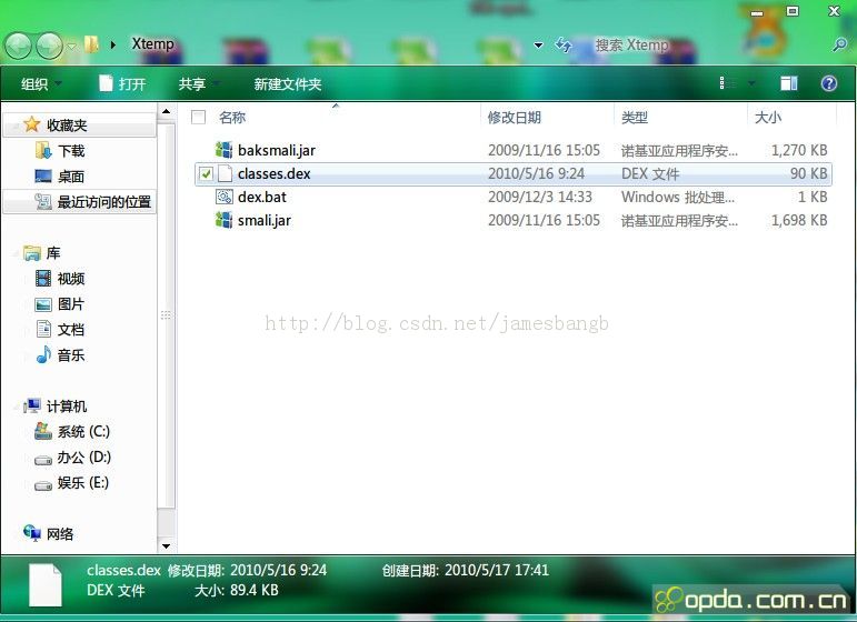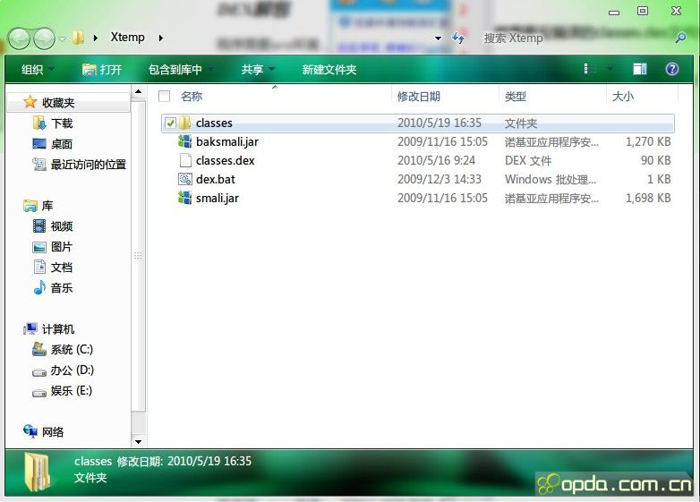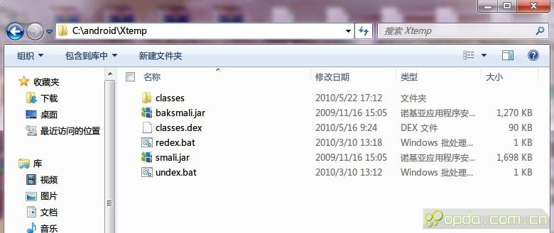 上述是在windows7系统下的操作,xp用户的操作略有不同,xp用户请在C盘根目录下创建一个android目录,将xp版本的dex解包工具Xtemp文件夹放到android目录下,如下图,