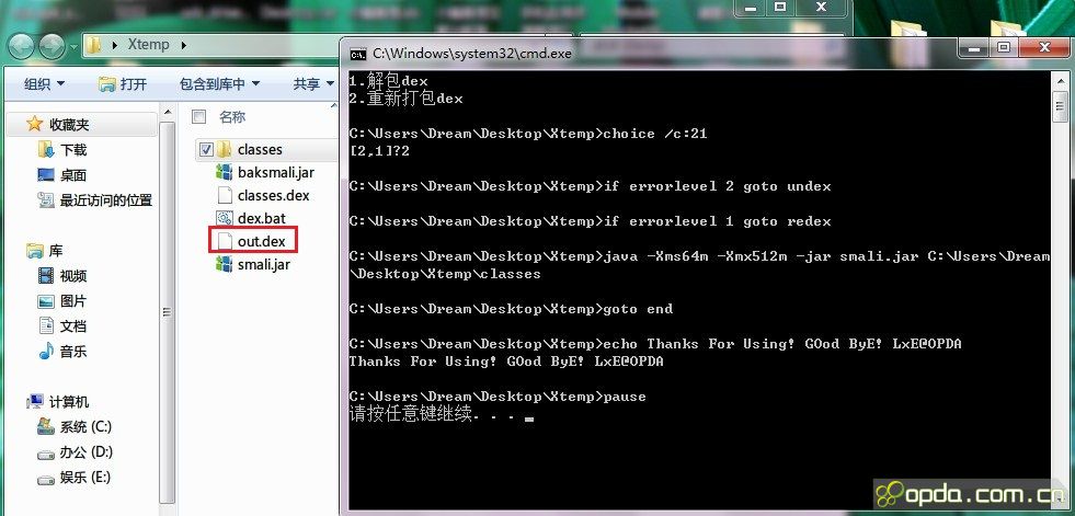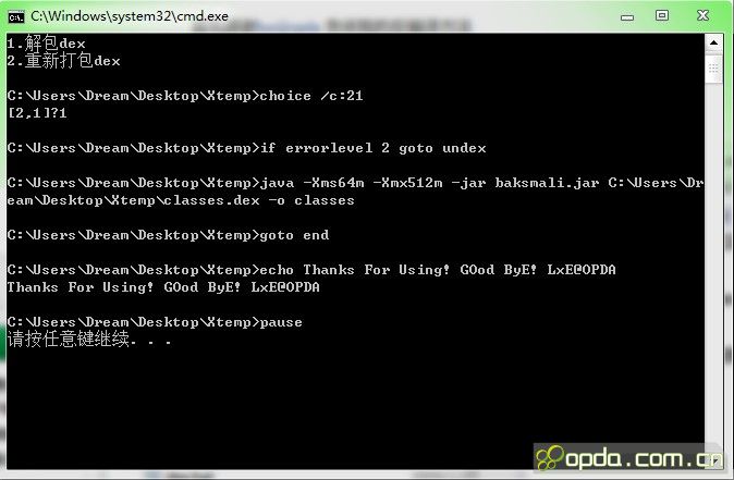 打包dex时,只需将classes文件夹拖到dex.bat上,然后按2,就开始打包了