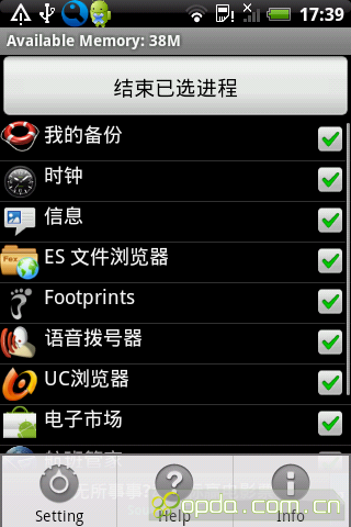 通过我们前面的汉化,我们会发现,在汉化了arsc和xml后,还有些地方是英文的,例如下面两图中的Setting,Help,Info和Available Memory:,这4个地方都还是英文,下拉通知栏,里面也还有一些英文,这些没汉到的地方,就基本上就在dex文件里了!