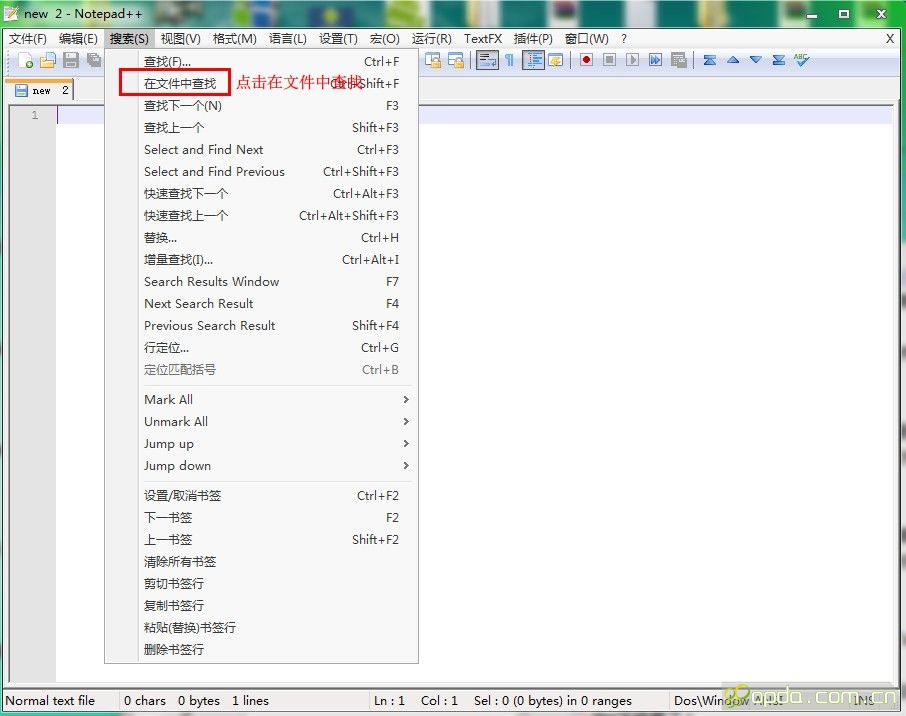 首先打开Notepad++,然后选择上方菜单栏中的“搜索”,选择“在文件中查找”,