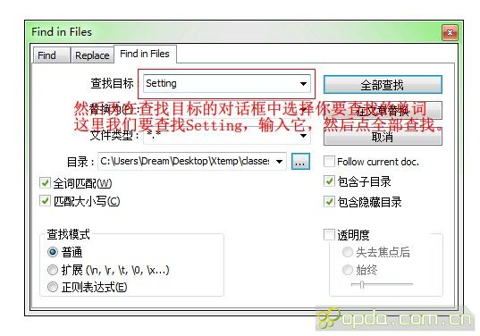 然后在“查找目标”后面的输入框中输入你要查找的单词,如这里我们要查找Setting,就输入它,然后点击右边的“全部查找”,稍等一会,就会为你搜索到全部文件中的Setting。