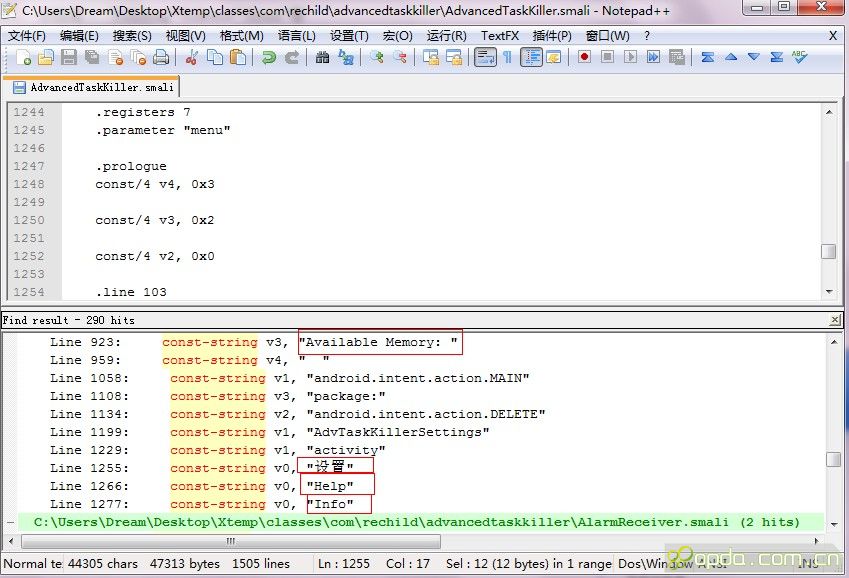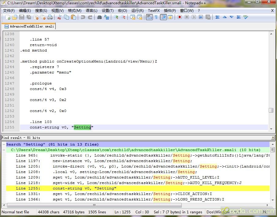 我们用Notepad++打开一个.smali文件,都是程序代码,看着都晕,这哪个是要汉的呢?