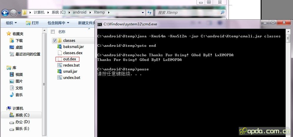 Xp下的用户在打包dex时,请将classes文件夹拖拽到redex.bat上,出现如下界面时说明打包成功,并会在同目录下创建一个out.dex文件,只需重命名为classes.dex替换原文件即可。