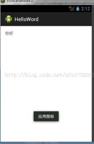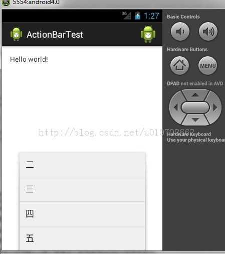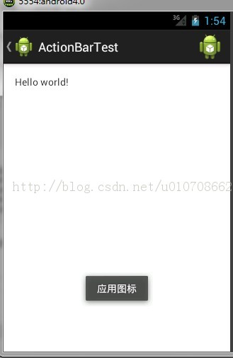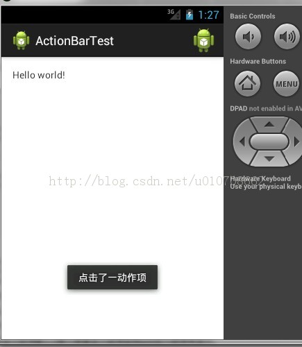 public class HelloWorld extends Activity { @Override protected void onCreate(Bundle savedInstanceState) { super.onCreate(savedInstanceState); setContentView(R.layout.activity_hello_word); } @Override public boolean onCreateOptionsMenu(Menu menu) { // Inflate the menu; this adds items to the action bar if it is present. getMenuInflater().inflate(R.menu.hello_word, menu); return true; }}private boolean MenuChoice(MenuItem item){ switch(item.getItemId()){ case android.R.id.home: toastPrint("应用图标"); Intent i = new Intent(this,HelloWorld.class); startActivity(i); return true; case 0: toastPrint("点击了一动作项"); return true; case 1: toastPrint("点击了二动作项"); return true; case 2: toastPrint("点击了三动作项"); return true; case 3: toastPrint("点击了四动作项"); return true; case 4: toastPrint("点击了五动作项"); return true; } return false; }当点击应用程序图标后会自动跳转到HelloWorld。