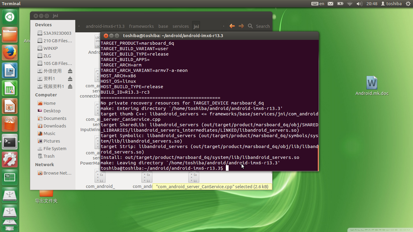 接着在源代码下边导入com_android_server_Canservice.cpp进行编译得到了libandroid_servers.so如下图。